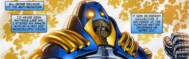 Quase nada se sabe sobre esse personagem, o que se sabe é que ele é a personificação de toda a antimatéria. Mas isso faz dele uma ameaça para o universo inteiro através de seu quase ilimitado poder cósmicos. Contudo seu propósito é eliminar toda a matéria no universo. O Antimonitor tem a capacidade de absorver universos inteiros, manipular a matéria e energia em uma escala cósmica e transformar a própria essência da realidade.