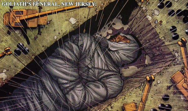 O Golias estava há um tempão na geladeira da Marvel, quando apareceu de repente na saga Guerra Civil. Isso só poderia significar uma coisa, saiu da geladeira para morrer. Dito e feito. Quando o Thor clone (clonado pelo Reed Richards) apareceu e convocou um raio que atravessou o corpo do herói.